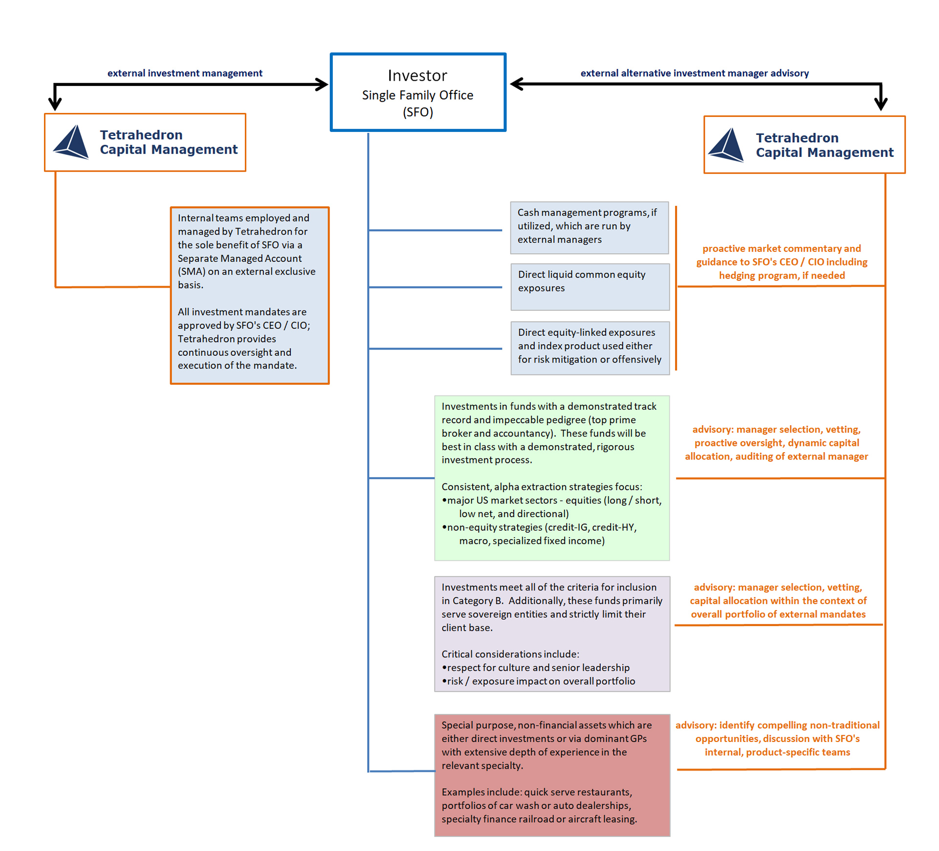 Tetrahedron authored a MACO program for a non-US single family office with an AUM of >USD$10bn. This family office wanted a comprehensive program to serve as the foundation for investments in the Americas. The program categorizes asset classes by liquidity characteristics. Tetrahedron provides the family office with extensive market experience and works as an extension of its in-house investment professionals. Each MACO program is bespoke; an example is depicted below.